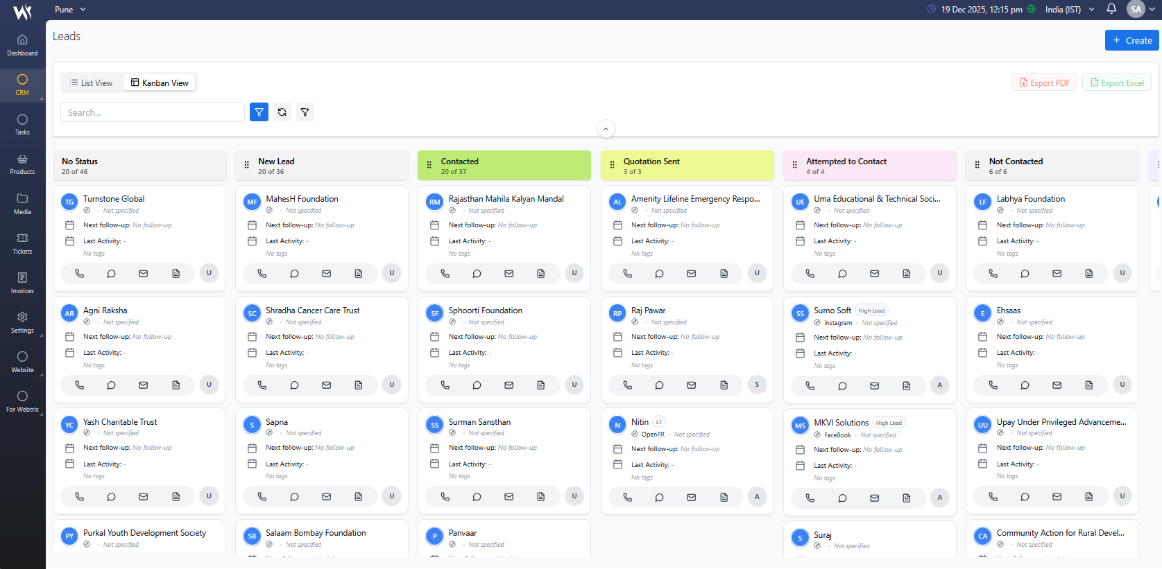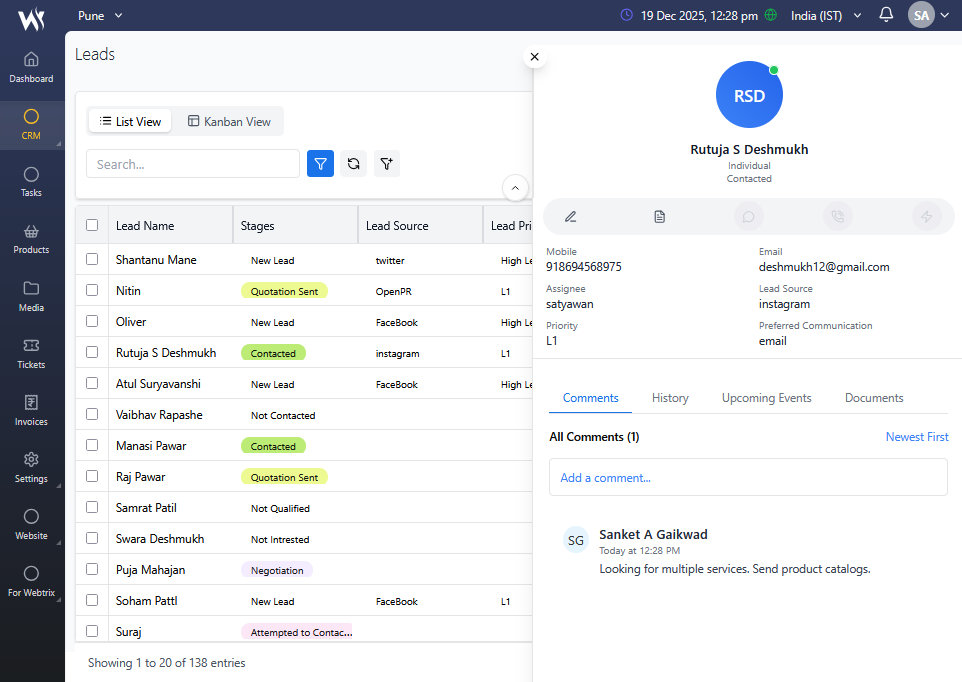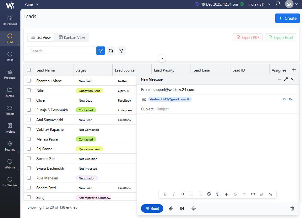 Absolutely. Webtrix24 CRM integrates with WhatsApp so you can send messages, invoices, and reminders directly to customers. It also supports GST-compliant invoicing with automatic tax calculations and payment tracking, making it ideal for Indian businesses.