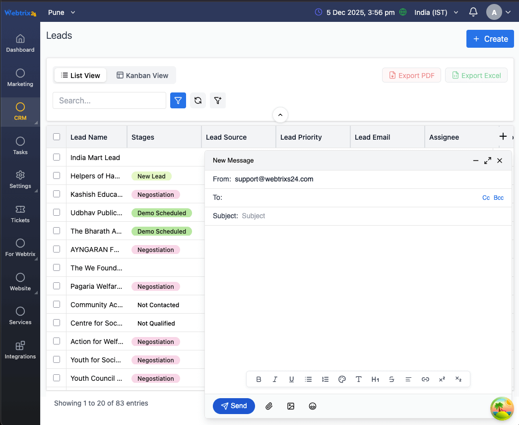 Absolutely. Webtrix24 CRM integrates with WhatsApp so you can send messages, invoices, and reminders directly to customers. It also supports GST-compliant invoicing with automatic tax calculations and payment tracking, making it ideal for Indian businesses.