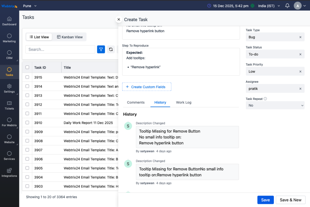 Effortlessly manage recurring tasks with Webtrix24 by setting them to automatically repeat at specified intervals. This feature ensures that routine activities are consistently scheduled and completed without manual intervention, streamlining workflows and reducing the risk of missed tasks.